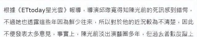 对于陈光前的死讯,邱黎宽感到错愕。 但她也透露,自己近几年和陈光前来往较少,对于他的近况自己也并不了解。 在圈内好友感叹之际,陈光前离世的情况,也侧面反映出来独居生活的“残酷现实”。 据悉,陈光前并未传出过结婚的消息,更不用说有没有孩子。