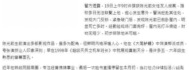 警方经过调查后,确认屋内没有打斗痕迹,财产也没有短少的情况,初步排除了他杀的可能。 而在陈光前去世后,其家属透露了更多细节。