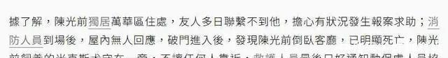据台媒报道,陈光前是在离世多日后,尸体才被发现。 陈光前尸体被发现前,其好友发现多日来都联络不上他,察觉不对劲后选择报警求助。 消防员也在第一时间赶到了陈光前家中,但当时大门紧锁。 呼叫无应后消防员选择破门,但为时已晚。 破门后,屋里的景象让人大吃一惊。